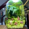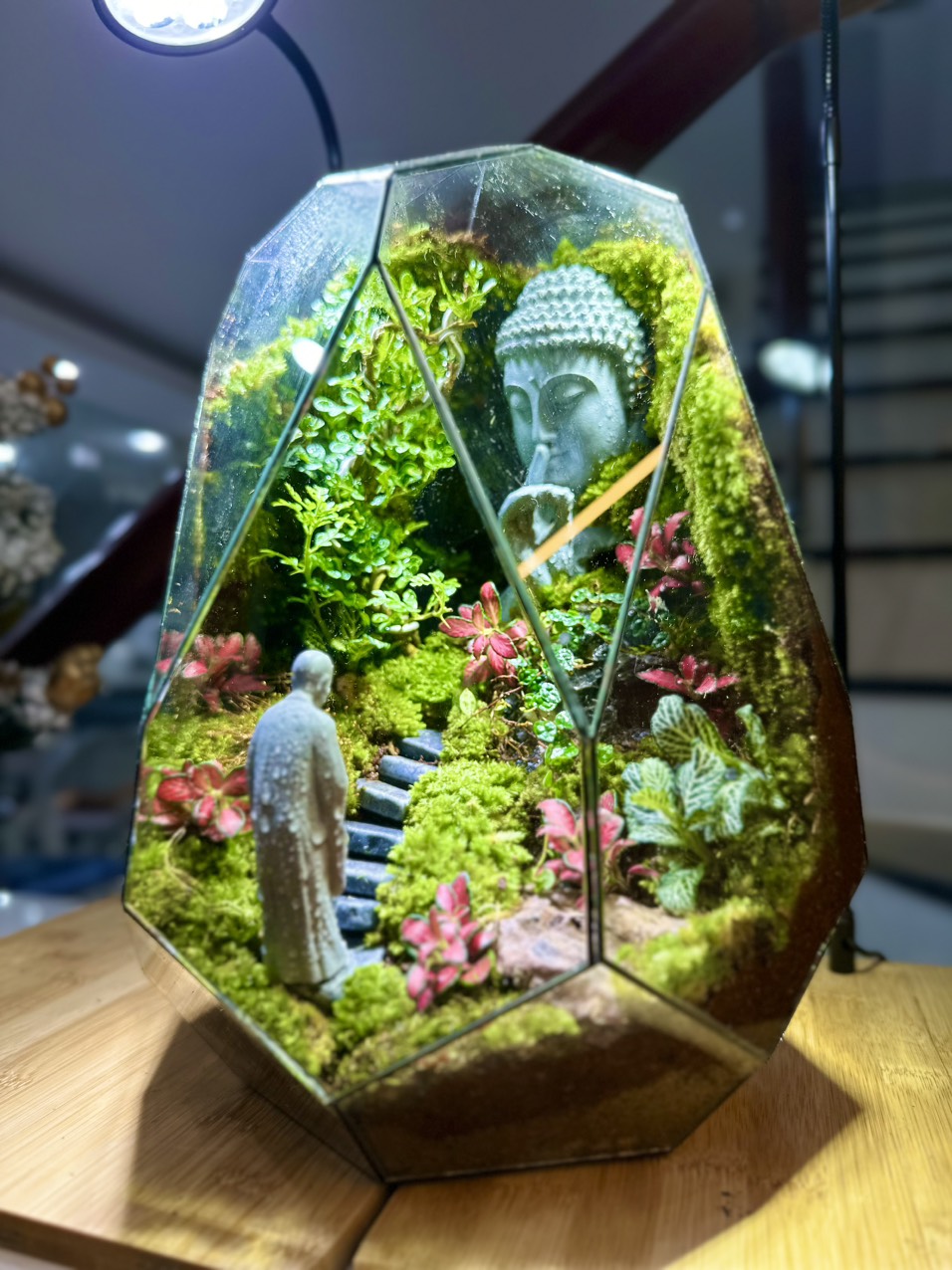 Bình Terrarium thiền sư bái Phật thuộc hệ kín, dễ chăm sóc. Bình Terrarium thiền sư bái Phật có layout được thiết kế bao gồm cần thăng bonsai, mô hình tượng Phật, thiền sư, đá, rêu rừng tự nhiên, đá, cẩm nhung v.v… Sản phẩm thích hợp trang trí bàn làm việc, phòng khách, quà tặng đối tác, lãnh đạo.