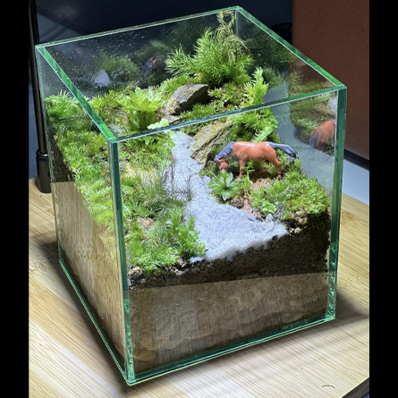 Bình Terrarium Cubic vuông không nắp thuộc hệ mở. Với ý tưởng tái hiện khung cảnh một dòng suối nhỏ có động, thực vật, bình cubic vuông hệ mở tạo ấn tượng với một màu xanh ngắt của nhiều loại rêu, đá. Loại bình terrarium này cần người chơi mỗi ngày xịt nước giữ ẩm bề mặt.