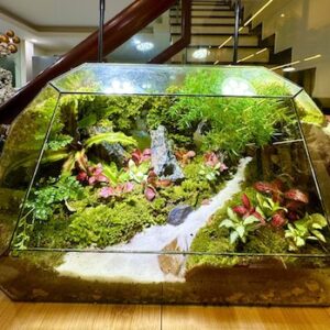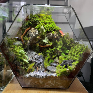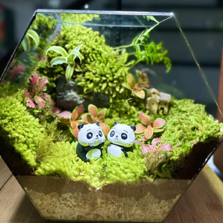 Bình terrarium lục giác gấu trúc là bình terrarium thuộc hệ kín. Bình terrarium lục giác gấu trúc có layout được tạo hình bởi đá, rêu rừng tự nhiên, dứa phụng, cẩm nhung nhiều màu, dương xỉ, mô hình gấu trúc v.v… Sản phẩm thích hợp để trang trí phòng khách trong gia đình và quà tặng đối tác.